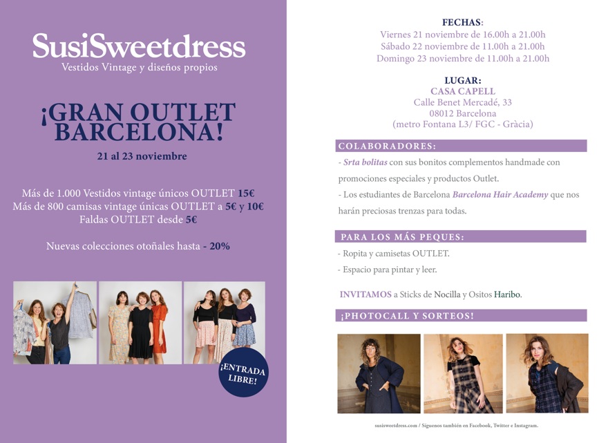 Para las que estéis lejos y no podáis ir al Gran OUTLET de Barcelona, el 21 noviembre activaremos en la shop online más de 200 vestidos y camisas vintage nuevos a precios OUTLET, faldas desde 5€ y las colecciones con descuentos hasta -20%.